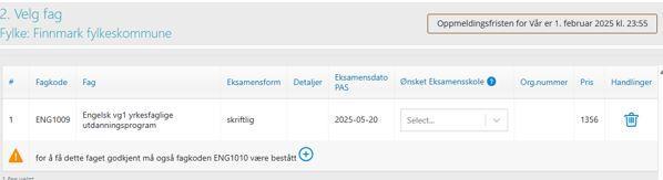 Merk at skriftlig, muntlig, muntlig-praktisk eller praktisk eksamen i samme fag har ulike fagkoder og du må betale for hver eksamen. I fag som krever flere eksamener, trenger du ikke ta alle i samme eksamensperiode.